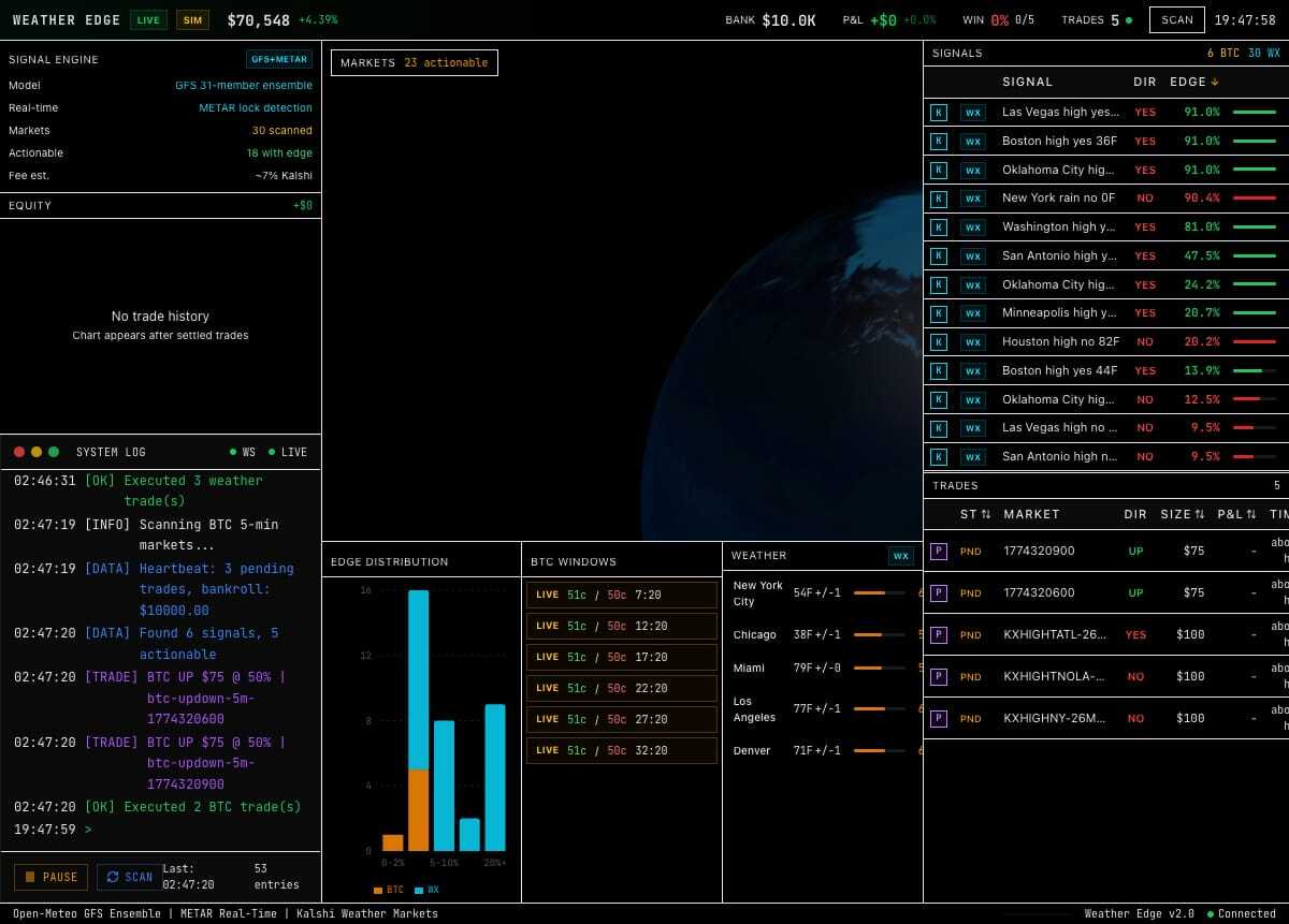 Our dashboard pulls real-time airport sensor data and 31-member GFS ensemble forecasts, computes the true probability of each outcome, and compares it against live Kalshi prices. When there's a gap big enough to beat the fee, it flags it.