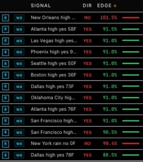 Run the script. It checks every open Kalshi weather market.